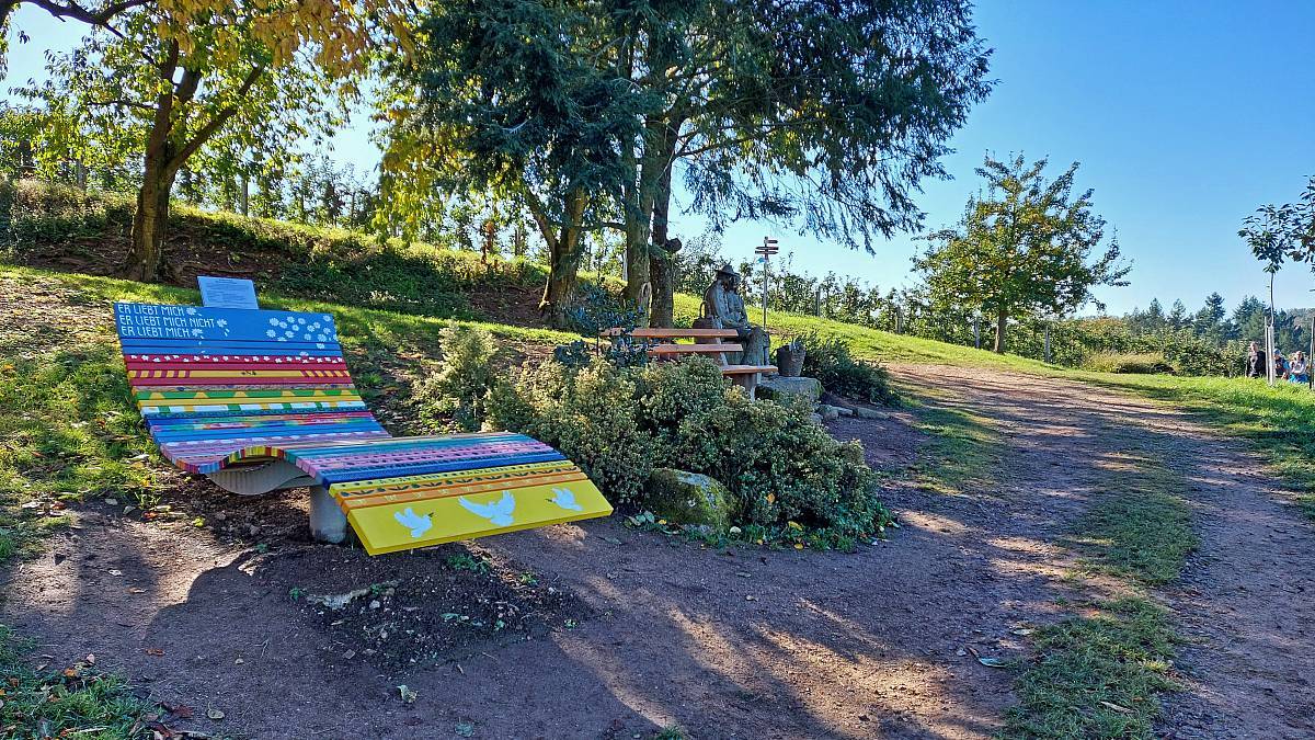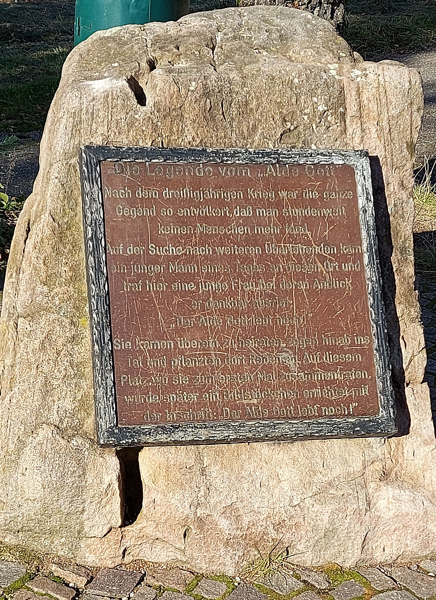 Kurz vor dem Ziel erfährt man noch was es mit dem Begriff „Alde Gott“ auf sich hat. Das ist keine Marketingerfindung der Saschwallener Winzergenossenschaft, sondern soll auf eine Begebenheit im dreißigjährigen Krieg zurückzuführen sein. Als im entvölkerten Gebiet ein junger Mann eine Junge Frau traf soll er ausgerufen haben „Der alde Gott lebt noch“. Dieser Ausspruch wird seither mit einem Bildstock in Ehren gehalten.