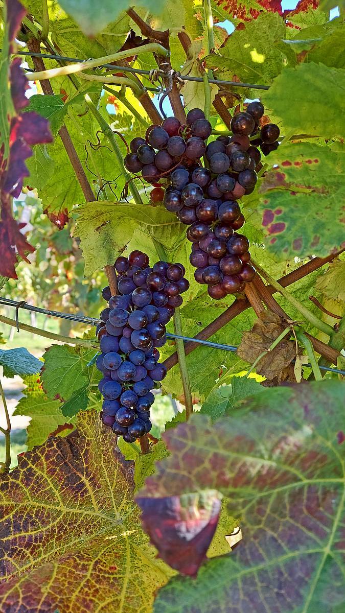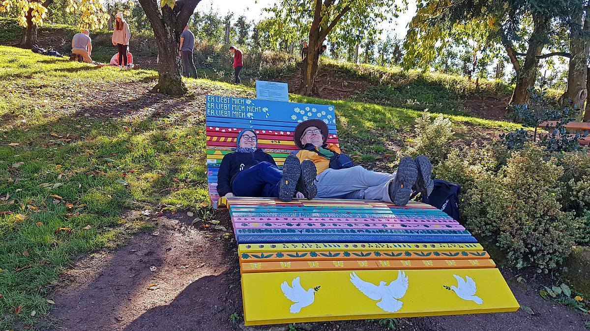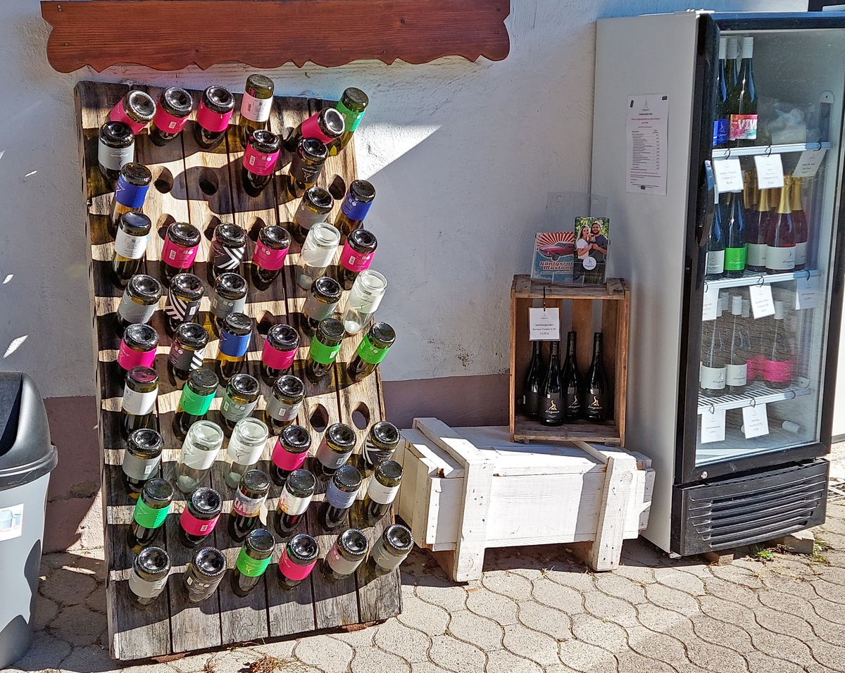 Kurze Zeit später lädt eine etwas zu groß gewordene Sonnenliege ebenfalls zum Rasten ein. Hier bilden einige Obstbäume den Übergang zu den Weinbergen, die den Wanderer jetzt auf dem Rest der Tour begleiten. Kleinflächiger Weinanbau mit immer wieder anderen Rebsorten bestimmen das Bild. Zwangsläufig kommt der Gedanke auf, dass man den Wein auch mal testen will. Dazu haben alle, die nicht mehr heim fahren müssen unterwegs mehrmals die Gelegenheit. Der Weg führt bis in den Talgrund, um dann auf der gegenüberliegenden Seite zum Ausgangspunkt zurückzukehren.